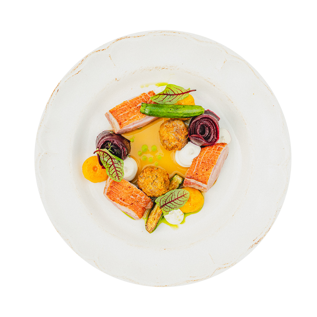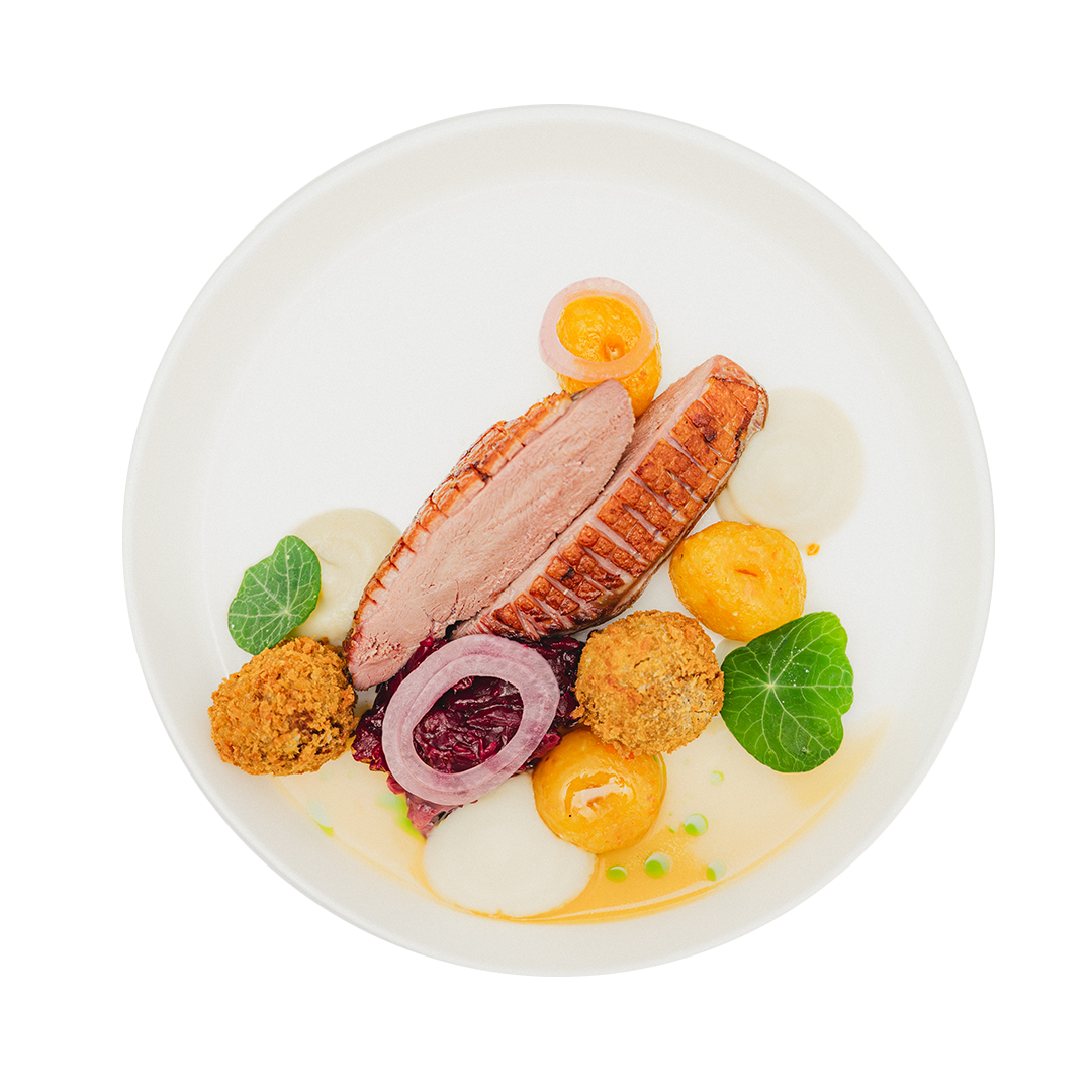 Pierś z kaczki | krokiety z konfitowaną kaczką i żurawiną | sos z pieczonej kaczki | dyniowe kluski śląskie | puree z topinamburu | piklowany burak
