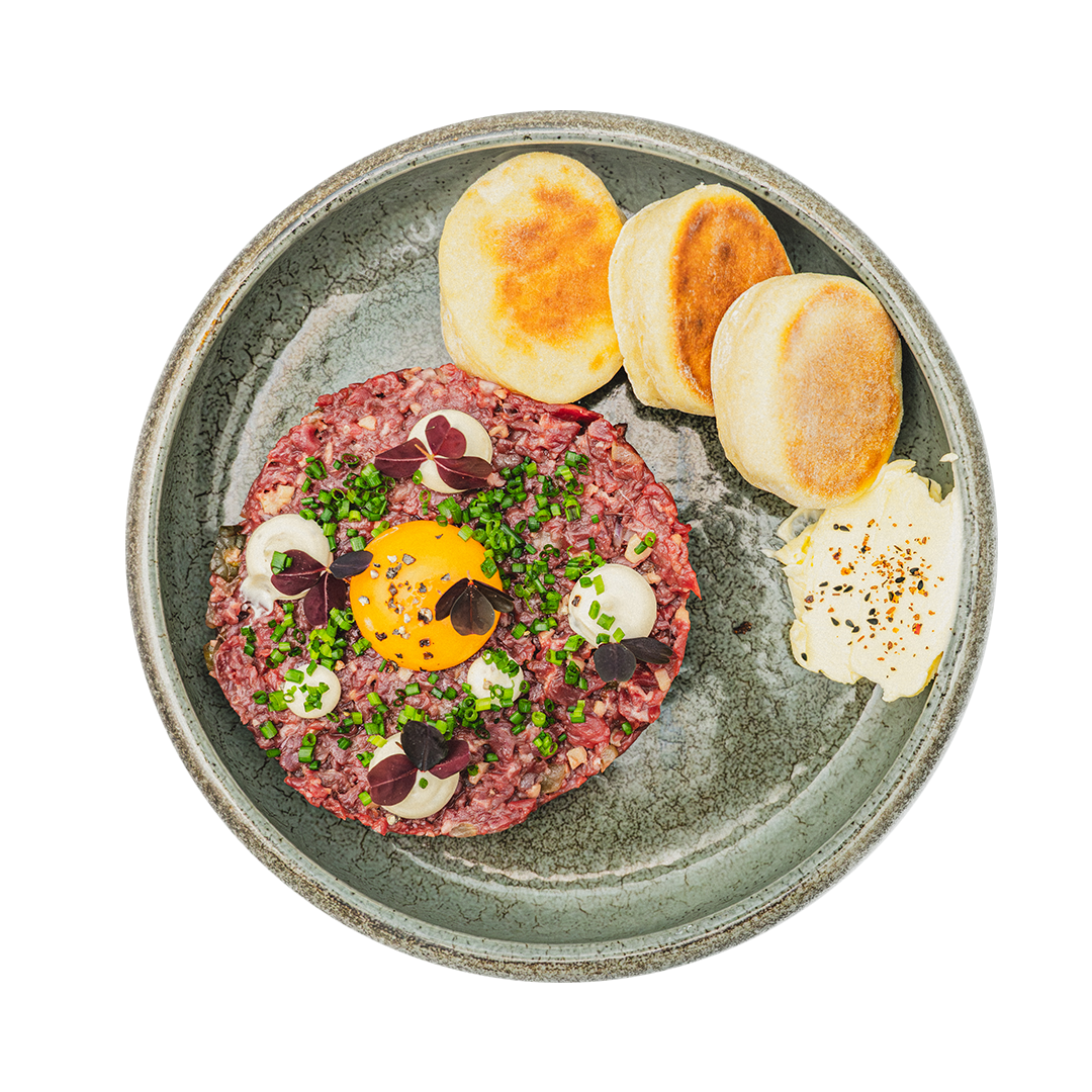 Tatar ze świecy wołowej | piklowane warzywa | żółtko | majonez truflowy | masło | proziak