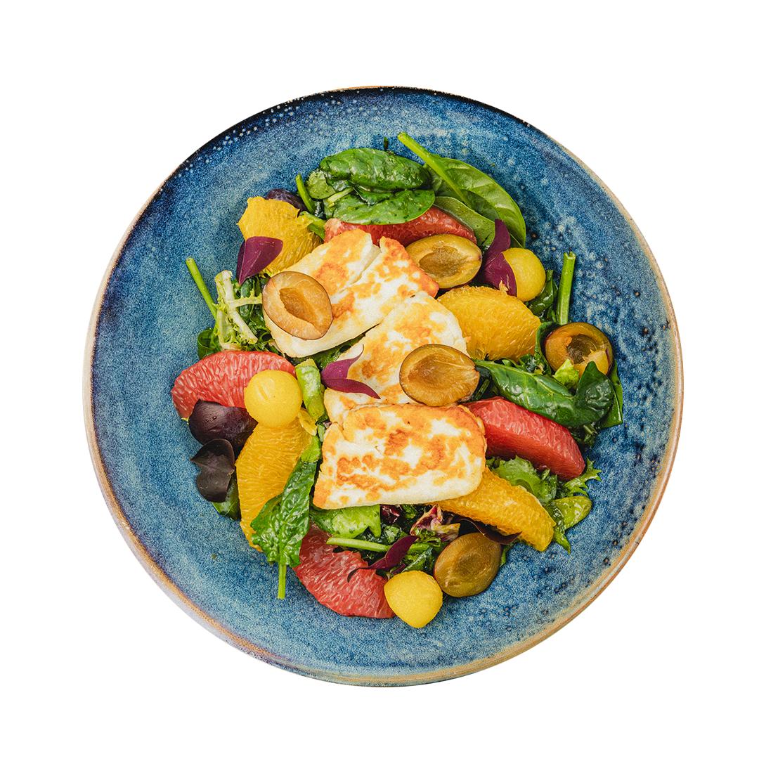 „Halloumi” selekcja sałat | grillowany ser halloumi | pomarańcza | grejpfrut | gruszka | śliwka | sos winegret